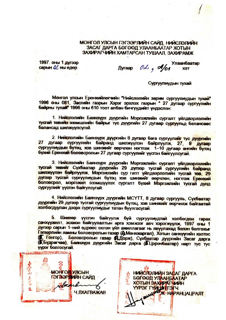 | МУ-ын Гэгээрлийн сайд,НЗД-ын хамтарсан тушаал, захирамж | 1997-01-02 | 02, А/01 | 8-р бага сургууль, 27-р сургуулийг нэгтгэн ЕБ-ийн 27-р сургууль |