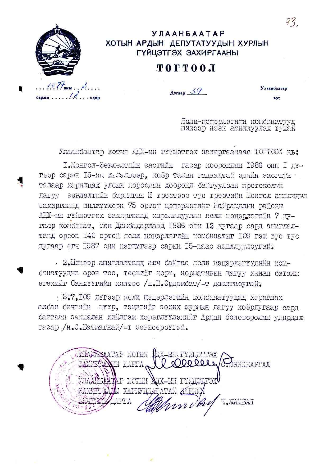 | АДХГЗ-ны тогтоол | 1987-02-18 | 39 | 109 дүгээр цэцэрлэг |