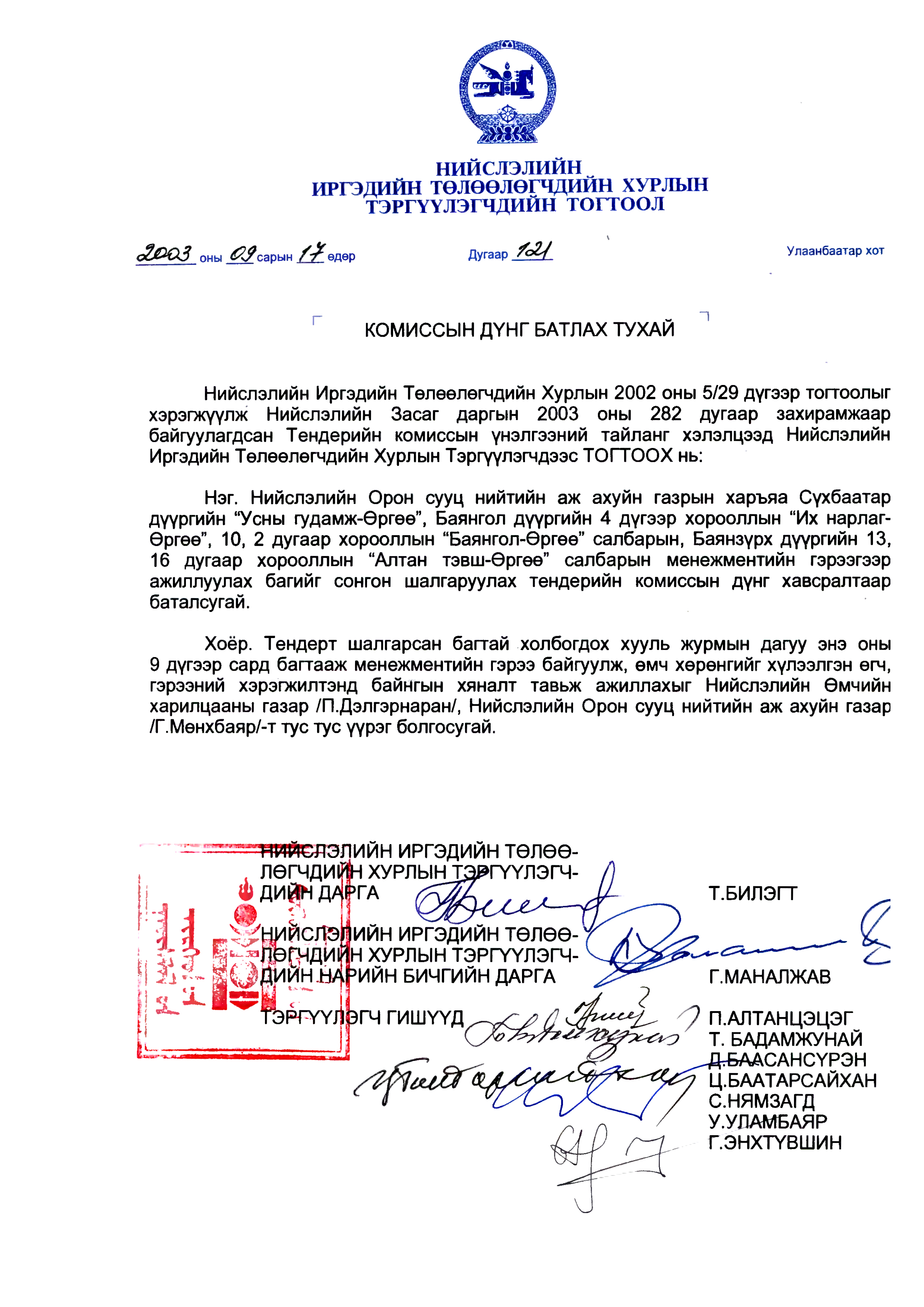 | НИТХ-ын тогтоол | 2003-10-01 | 121 | ОСНАА-н Санкомфорт ХХК |