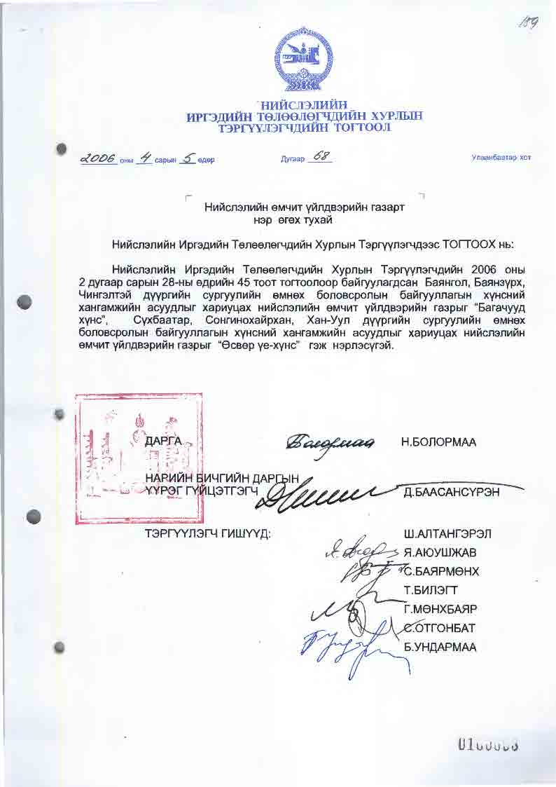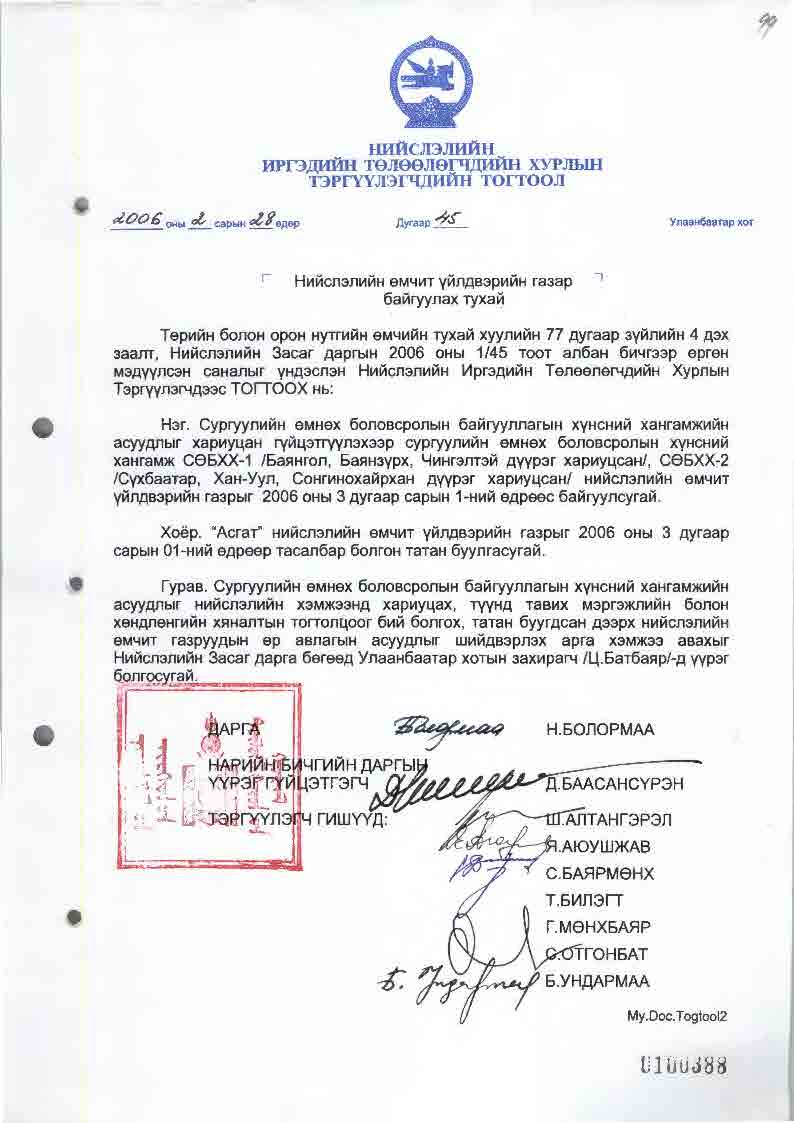| НИТХТ-ийн тогтоол | 2006-02-28 | 45 | СӨБХХ-1 /БГД, БЗД, ЧД хариуцсан/, СӨБХХ-2 /СБД, ХУД, СХД хариуцсан/ НӨҮГ байгуулагдав |